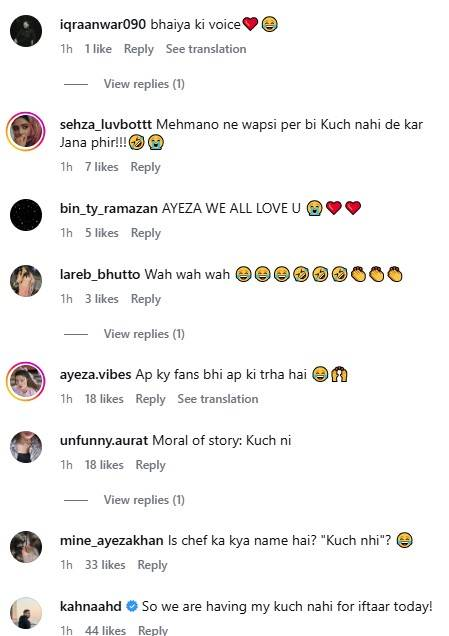 Fans flooded the comments with laughter and witty responses. One joked, “Okay, I’ll try this recipe. Amma will throw me out of the house,” while another wrote, “Yaar yeh ‘kuch nahi’ bohat yummy hota hai.” Many others shared that they planned to serve kuch nahi for iftar, appreciating Ayeza’s relatable and playful content.