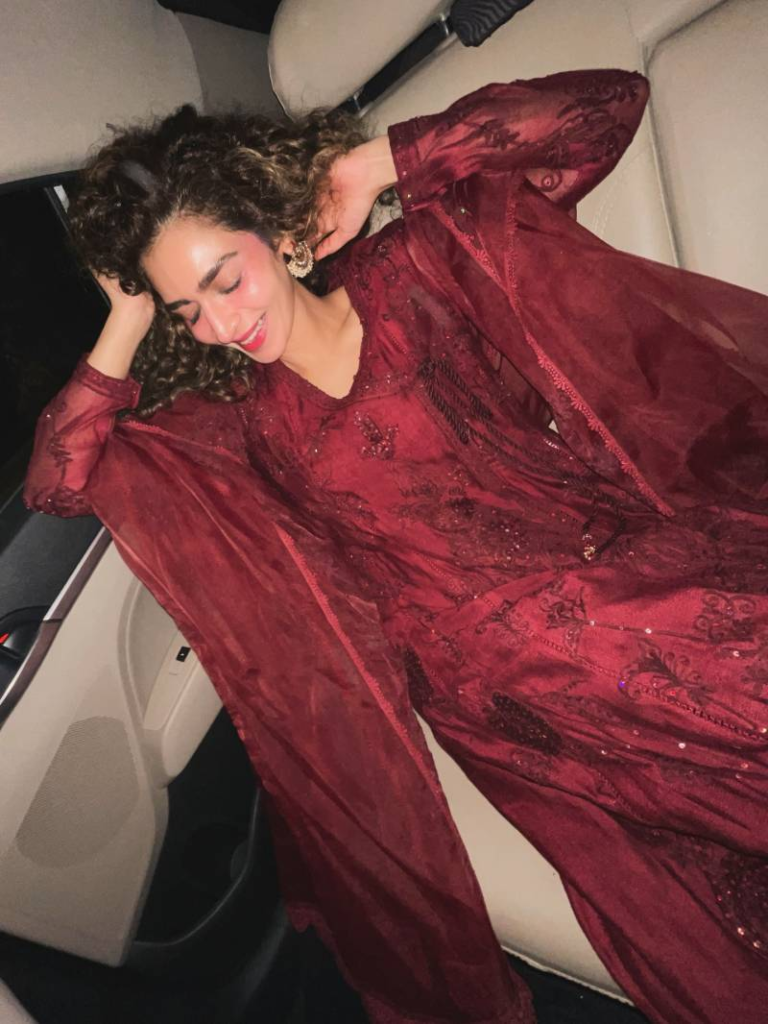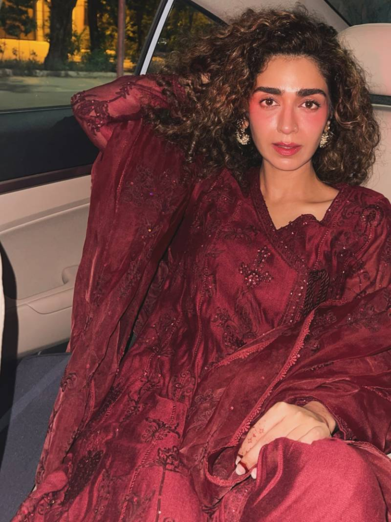 The first look embodies traditional elegance, with Hajra dressed in a rich maroon organza ensemble adorned with intricate tonal embroidery and subtle sequins. She paired the outfit with a sheer matching dupatta and classic gold jhumkas, while her voluminous curls, dewy complexion, and soft red lips complemented the festive aesthetic. The candid car setting adds an intimate, cinematic touch to the visuals.
