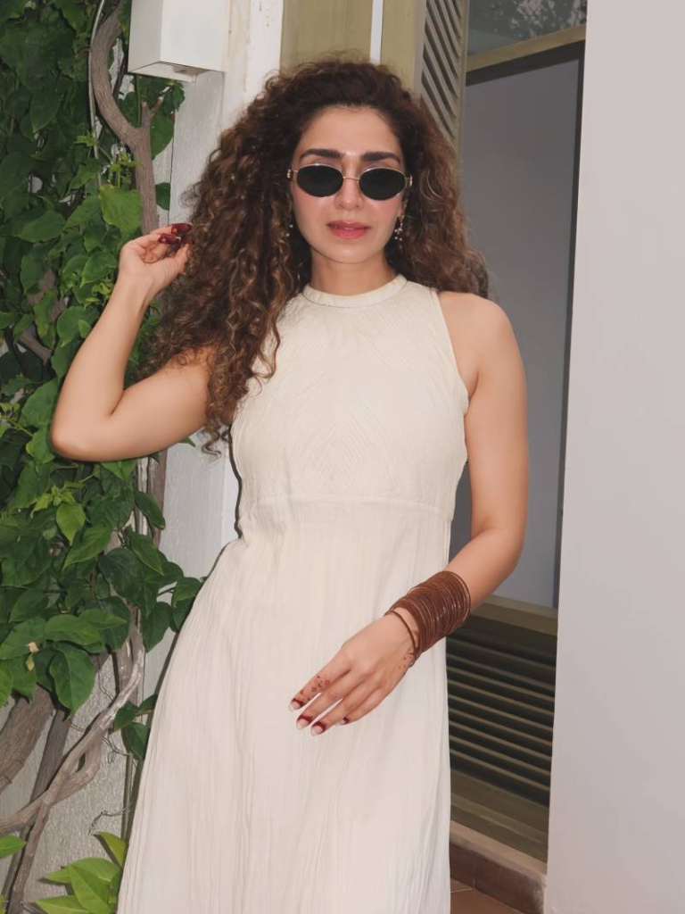In contrast, her second look embraces modern minimalism. A sleeveless cream tunic with structured pleats and matching fitted trousers creates a clean, contemporary silhouette. Carefully selected accessories—including retro-inspired sunglasses, stacked bangles, and neutral wedges—enhance the understated elegance. Set against a minimalist outdoor backdrop of white architecture and greenery, the look highlights Hajra’s ability to transition seamlessly between traditional and contemporary fashion.