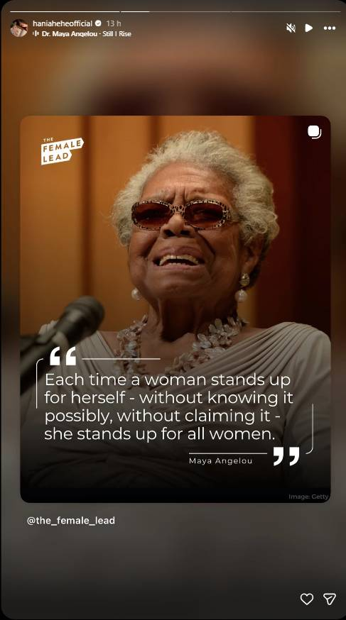 The actress posted an Instagram story featuring the words of legendary poet Maya Angelou, highlighting a quote that reads: “Each time a woman stands up for herself—without knowing it possibly, without claiming it, she stands up for all women.”