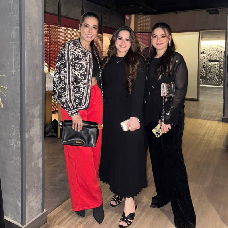 The twins complemented the mood with their own signature styles. Minal opted for a refined all-black look featuring a wrap-style top and tailored trousers. Aiman, meanwhile, chose a black pleated skirt dress that balanced elegance with ease. Together, the trio exuded confidence, charm and the kind of comfortable chemistry fans adore.