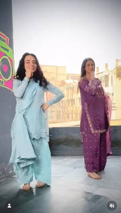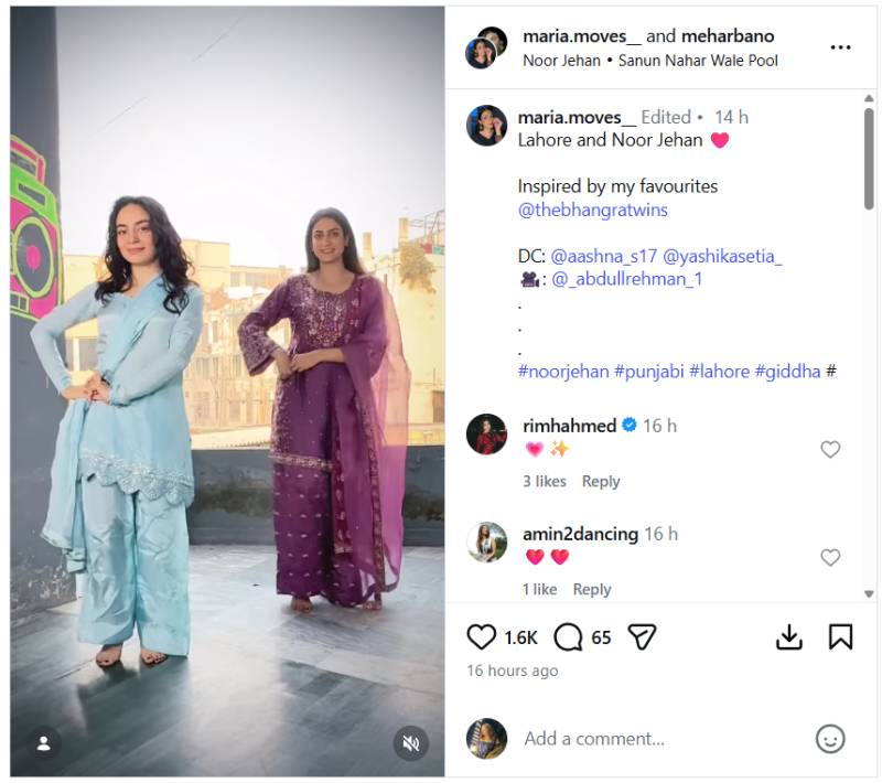 Behind her, Maria, the reel’s creator, adds visual contrast in a deep purple ensemble with intricate embroidery and a sheer dupatta. Their choreography is synchronized and restrained, blending classical and folk influences that match the emotional depth of Noor Jehan’s voice. The reel feels intimate and reflective, emphasizing mood and movement rather than overt performance, with the caption paying tribute to Lahore and Noor Jehan.