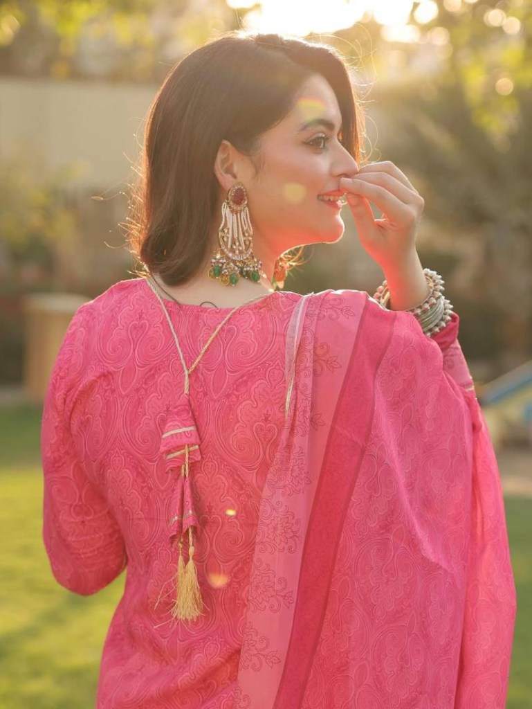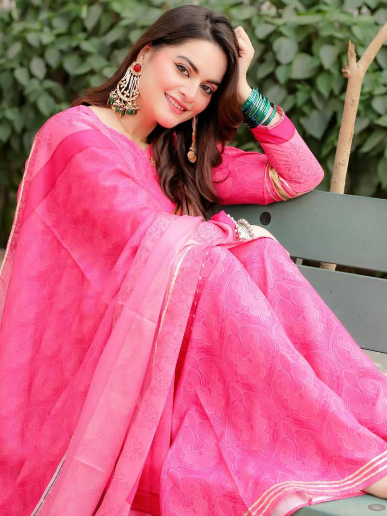 In the shoot, Minal wore a hot pink three-piece ensemble featuring a long-sleeved kurta adorned with intricate floral damask-style prints in lighter pink and silver tones. Gold lace borders on the sleeves added a touch of opulence, while a matching dupatta draped over one shoulder completed the traditional look. She accessorized with multi-layered oxidized silver jhumkas, a stack of ghungroo-embellished bangles, green glass bangles, and a delicate gold chain with an “H” pendant, balancing heritage with a contemporary flair.