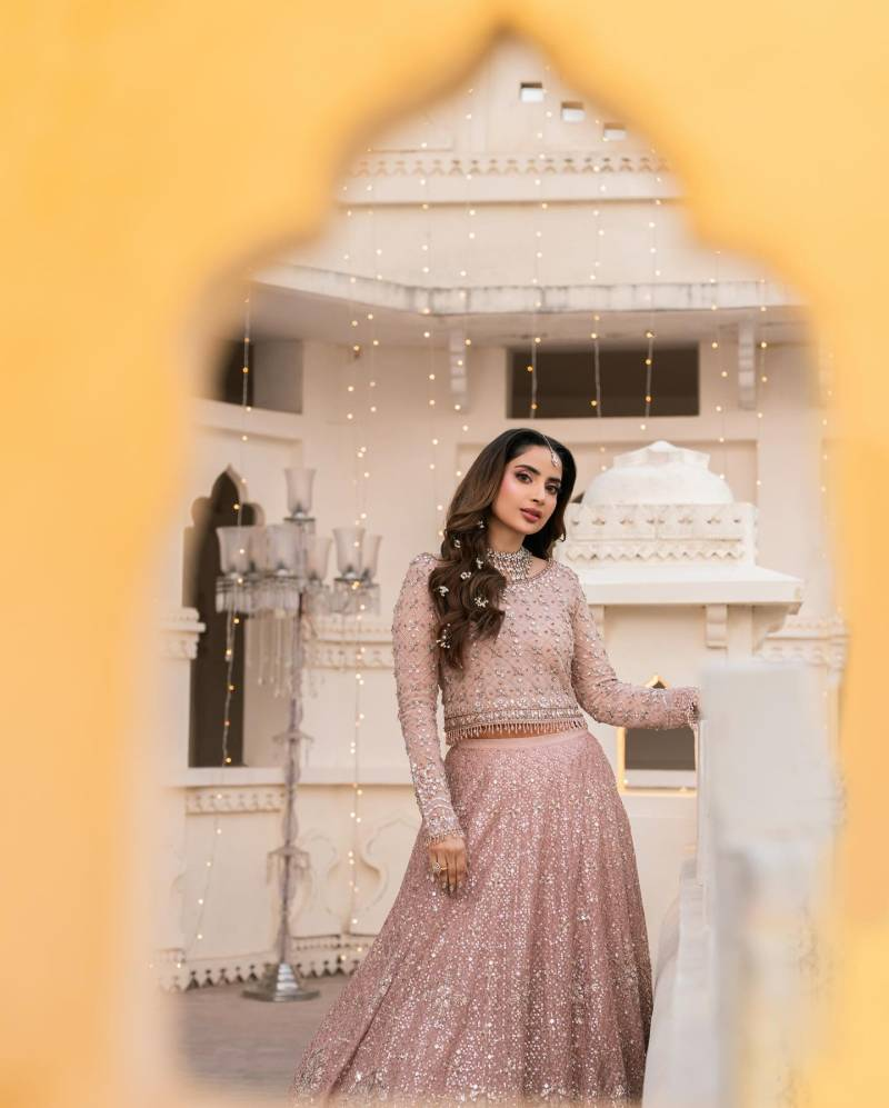 In the first look, Saboor wears a blush pink lehenga that radiates ethereal charm. The ensemble features intricate embroidery, shimmering sequins, and a long-sleeved blouse with a subtly sheer neckline. A flowing lehenga skirt and a sheer dupatta with a scalloped border complete the romantic aesthetic. Voluminous side-parted waves and delicate jewelry—including a statement choker, matching earrings, and a maang tikka—enhance the dreamy vibe.