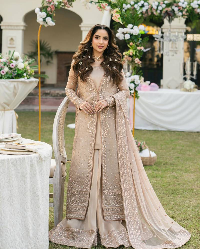 The fourth ensemble appears as an open gown sharaara, adding shimmer and subtle glow to Saboor’s collection of looks. The outfit demonstrates her ability to blend tradition with modern styling, delivering a versatile visual statement.