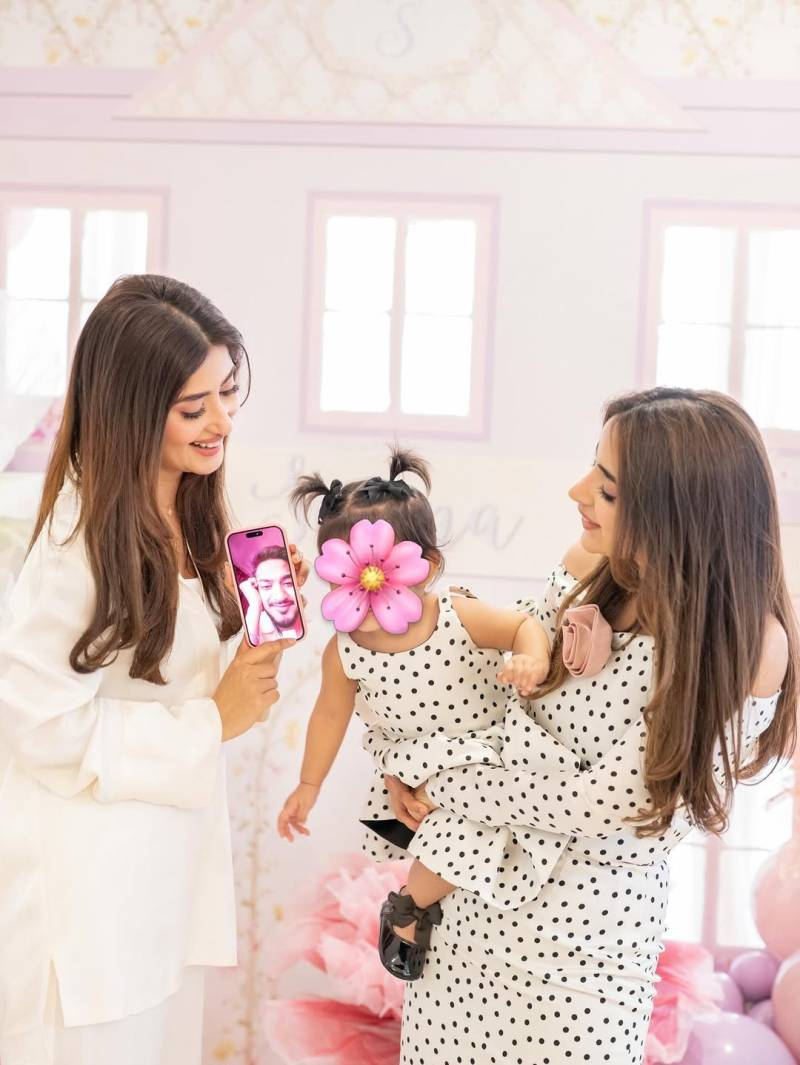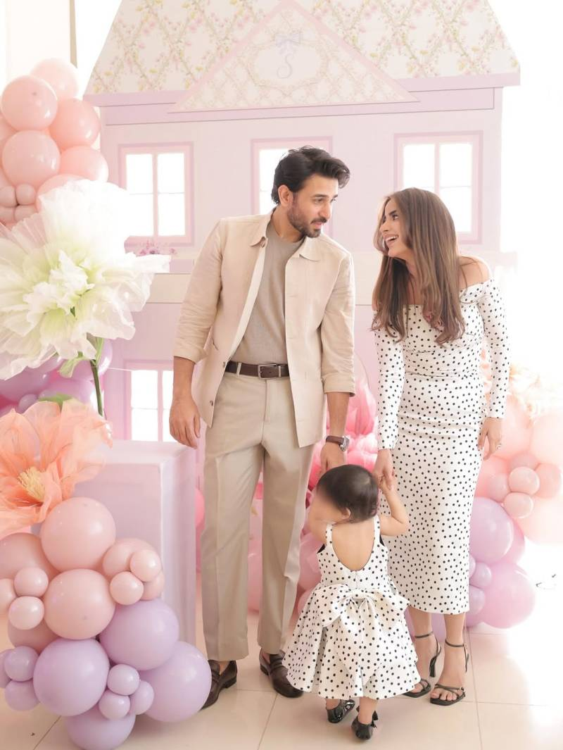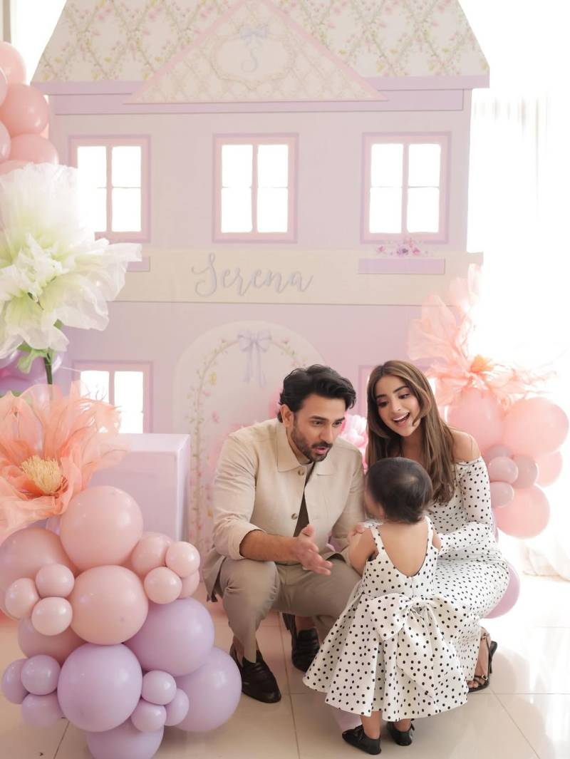 The birthday celebration itself was a dreamy pastel-themed affair. A custom lavender and pink dollhouse adorned with Serena’s name served as the centerpiece, surrounded by balloon arrangements and delicate floral decor. Saboor looked elegant in an off-shoulder white polka-dot dress, perfectly matching her daughter’s ruffled outfit, while Ali Ansari complemented the aesthetic in a neutral-toned ensemble.